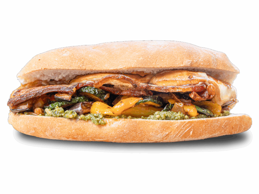 Panino artigianale con succulenta porchetta, filante provola grigliata e affumicata, basilico fresco, caponata di verdure estive (peperoni, zucchine, melanzane) e avvolgente pesto di basilico.